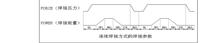 在連續焊接工作模式下,只能使用單脈沖焊接(第一脈沖),所以第二焊接脈沖的參數(UP2,WE2,DN1,ENERG2)均不使用,而且COL,HLD參數的定義與基本焊接模式有所不同,其各個焊接參數的邏輯關系參看圖。